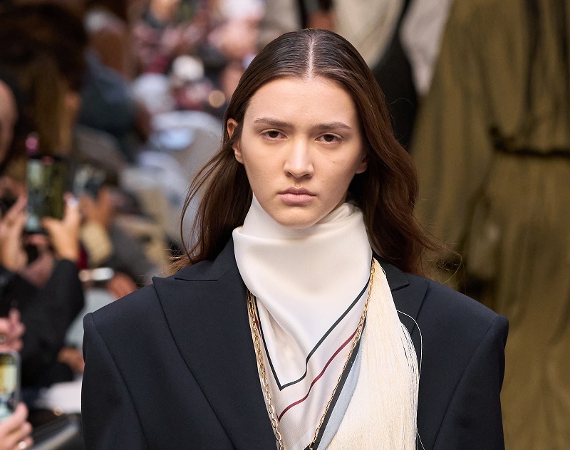 برزت صيحة جمالية راقية في عرض دار دانييل كالكاتيرا Daniele Calcaterra ، جسدت مفهوم “البساطة المترفّة”. فقد تألقت العارضة بمكياج خفيف يكاد يكون غير مرئي، حيث تم التركيز على بشرة مضيئة بلمسة من الترطيب العميق، ما منحها إشراقة صحية. فيما جاءت العيون خفيفة الظلال مع تحديد ناعم يكاد لا يُلاحظ، بينما اكتفت الشفاه بلمعة شفافة حيادية أبرزت نعومتها الطبيعية. أما الشعر فجاء مشدوداً إلى الخلف، بأسلوب ذيل الحصان المنخفض. هذه التسريحة منحت العارضة حضوراً قوياً وأظهرت ملامح الوجه بجرأة واضحة، مع لمسة من العصرية التي تناسب إطلالات النهار والمناسبات الراقية.