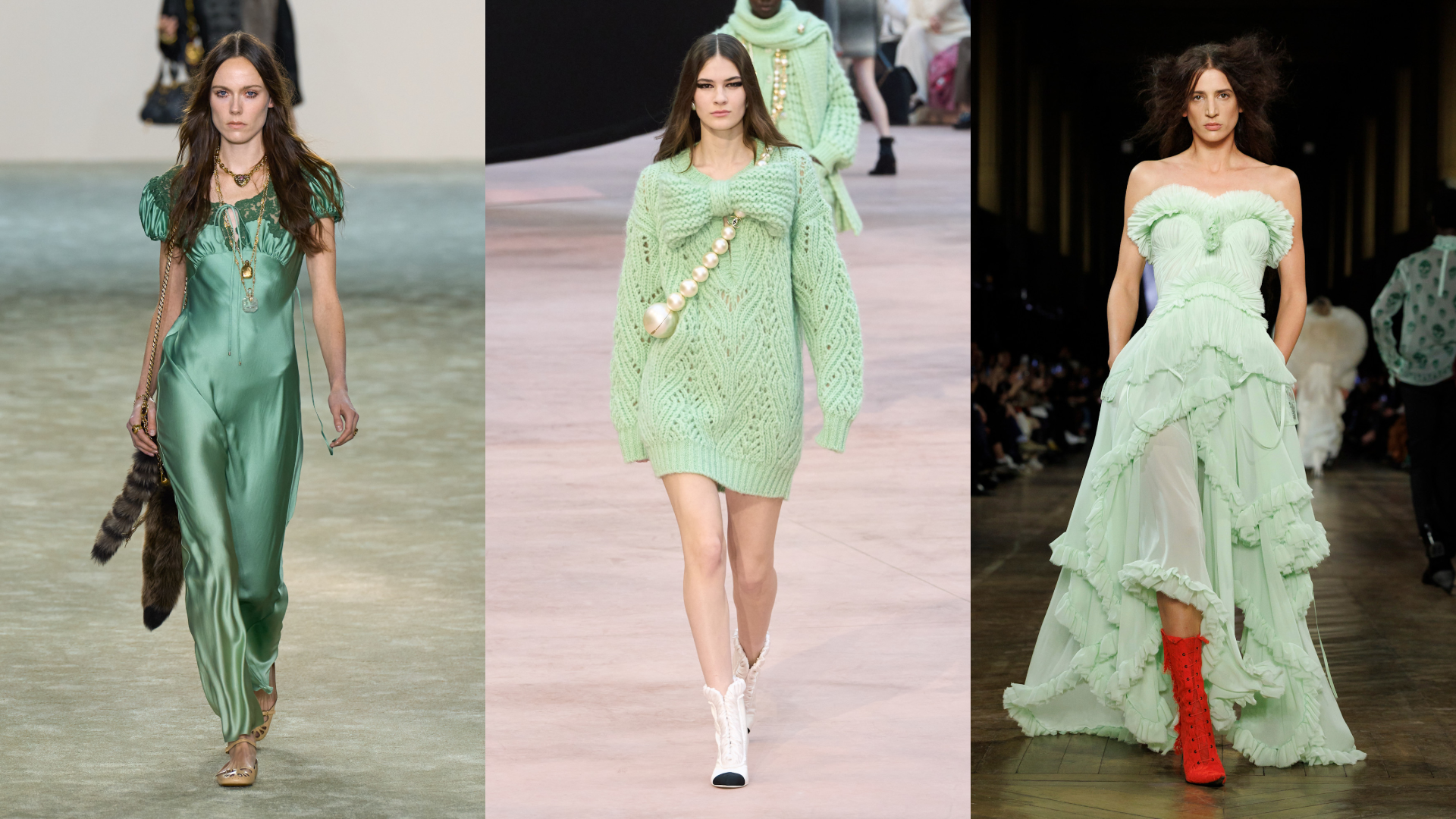 ظهرت درجات الأخضر النعناعية كصيحة مميزة لخريف 2025. هذه الدرجة الفاتحة من الأخضر، الباردة، والمطمئنة تقدم تبايناً ناعماً مع الدرجات الأعمق للموسم. في دار “كلوي” Chloé، ظهر اللون في الأقمشة الحريرية المنسدلة، بينما منحته “شانيل” Chanel لمسة عملية مريحة وأنيقة في الوقت نفسه.