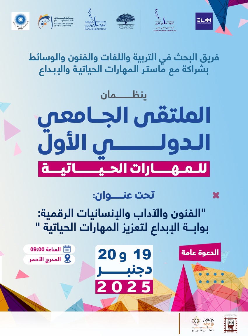 في إطار تعزيز المهارات الحياتية وتنمية الإبداع الثقافي والفني والرقمي، ينظم فريق البحث في التربية واللغات والفنون والوسائط، المنتمي إلى مختبر الديداكتيك واللغات والوسائط والدراماتورجيا، بشراكة مع ماستر المهارات الحياتية والإبداع بكلية اللغات والآداب والفنون – جامعة ابن طفيل بالقنيطرة، الملتقى الجامعي الدولي الأول للمهارات الحياتية، وذلك خلال يومي 19 و20 دجنبر.