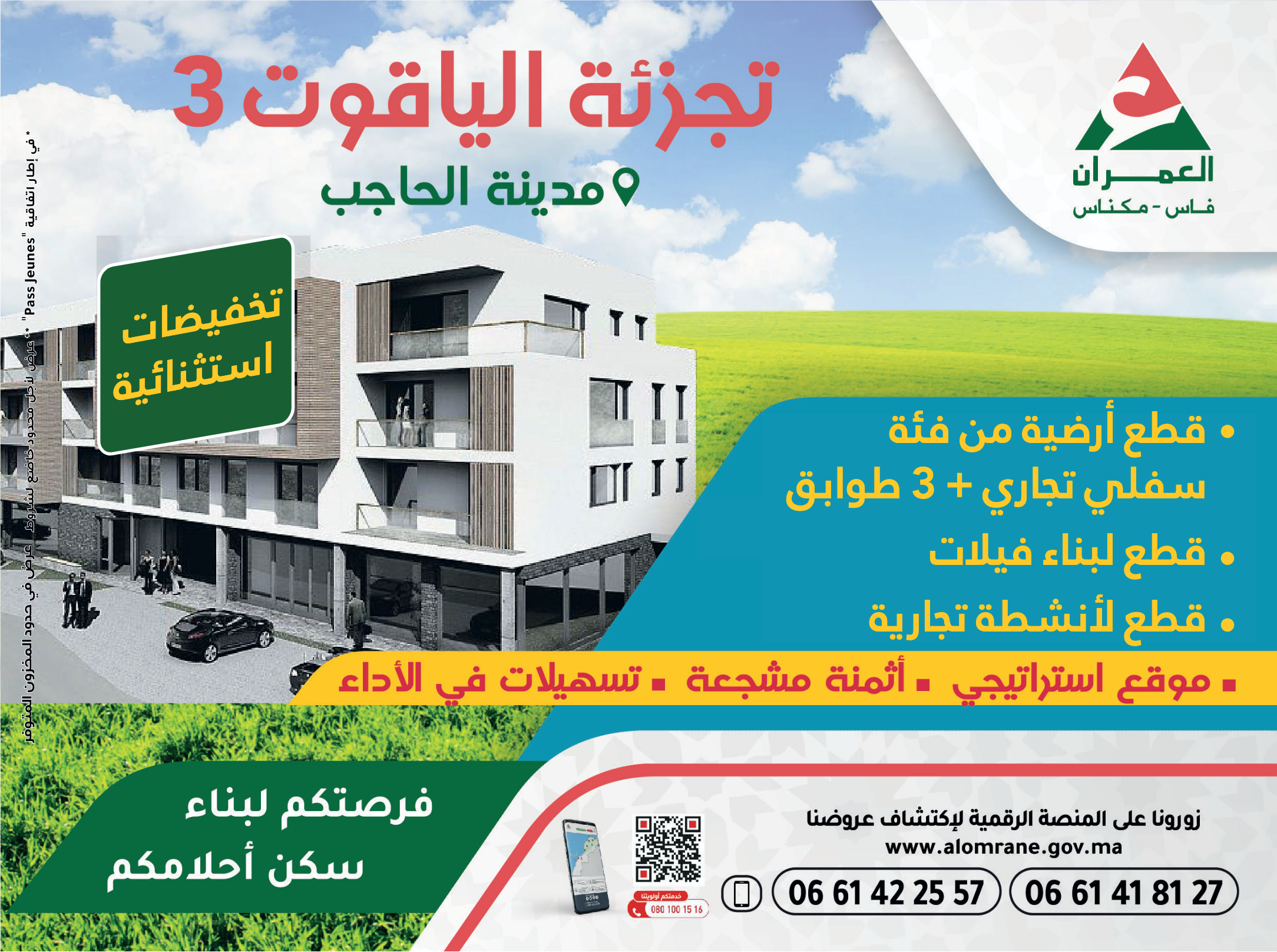 مشروع تجزئة ” الياقوت 3 “يوفر فرصة رائعة بأثمنة مناسبة ،وتسهيلات في الاداء ،وقطع أرضية سكنية من فئة سفلي تجاري + 3 طوابق بمساحات مختلفة،..،لكل من يرغب الاستقرار في مدينة الحاجب أو الاستثمار في المستقبل .