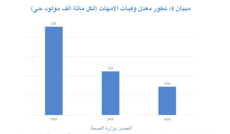 إلى ذلك، أكد التقرير ذاته، انخفاض معدل وفيات الأمهات من 112 حالة وفاة لكل 100.000 مولود حي سنة 2010 إلى 72.6 سنة 2018، وكان التقدم أكثر وضوحا في الوسط الحضري مقارنة بالوسط القروي، حيث سجل هذا المعدل سنة 2018، على التوالي 44.5 و111.1 حالة وفاة لكل 100.000 مولود حي.