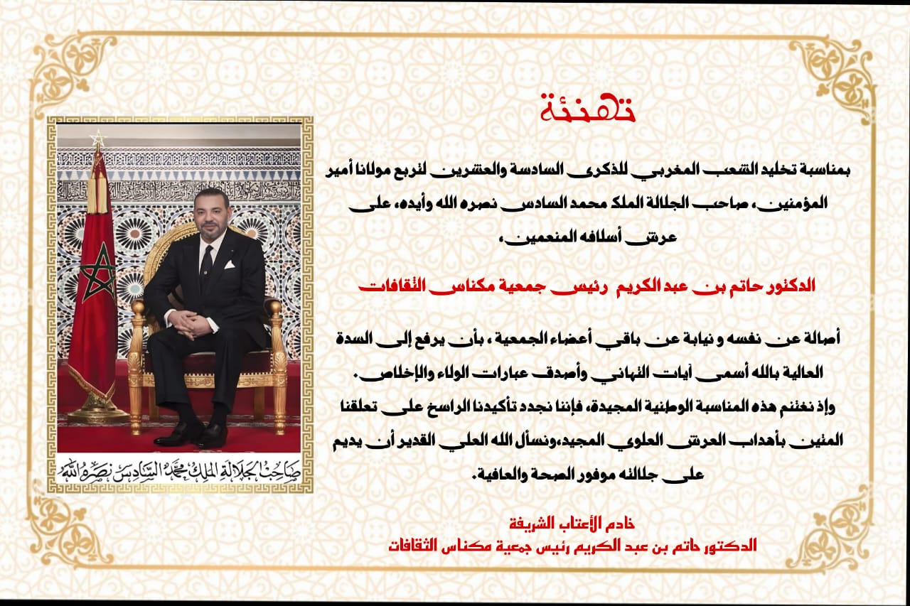 بمناسبة تخليد الشعب المغربي للذكرى السادسة والعشرين لتربع مولانا أمير المؤمنين، صاحب الجلالة الملك محمد السادس نصره الله وأيده، على عرش أسلافه المنعمين، يتشرف رئيس جمعية مكناس الثقافات ، في شخص رئيسها الدكتور حاتم بن عبد الكريم ، أصالة عن نفسه و نيابة عن باقي أعضاء الجمعية ، بأن يرفع إلى السدة العالية بالله أسمى آيات التهاني وأصدق عبارات الولاء والإخلاص.