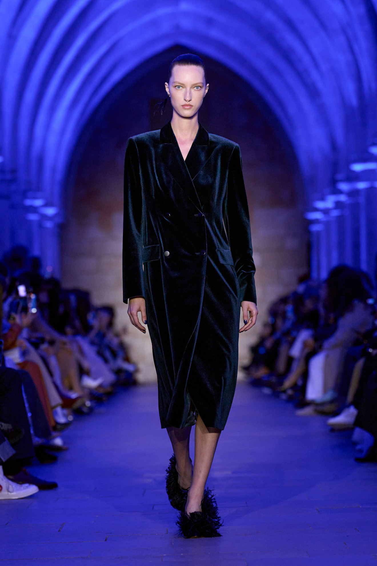 في عرض “أكريس”، لفت المعطف باللون الكحلي الملكي الأنظار بفضل اللمسة المخملية التي تعكس الأناقة الملكية والدفء.