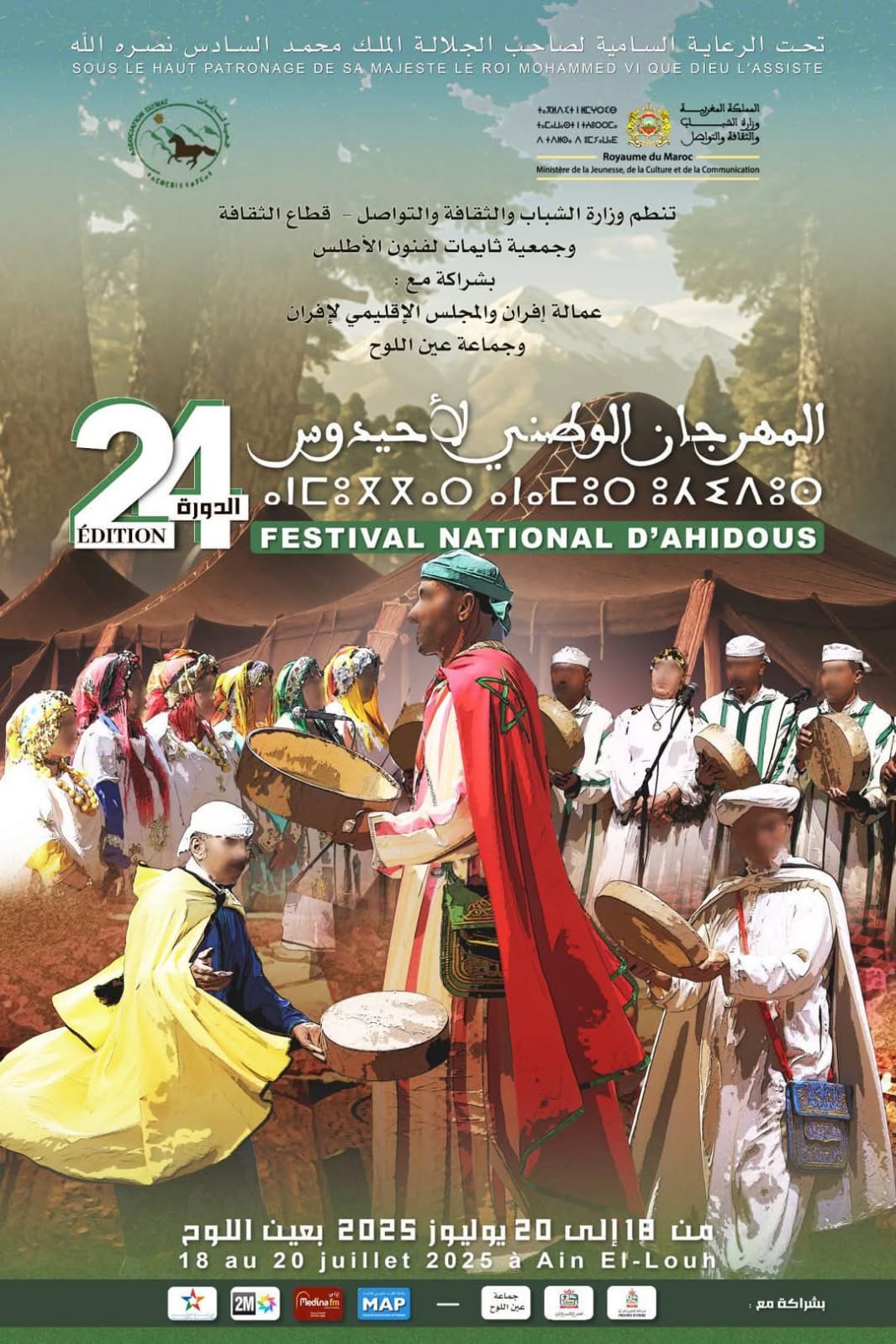 تحت الرعاية السامية لصاحب الجلالة الملك محمد السادس نصره الله وأيده، تنظم وزارة الشباب والثقافة والتواصل – قطاع الثقافة – وجمعية ثايمات لفنون الأطلس، وبشراكة مع عمالة إقليم إفران والمجلس الإقليمي لإفران وجماعة عين اللوح، الدورة الرابعة والعشرين للمهرجان الوطني لفن أحيدوس، أيام 18 و19 و20 يوليوز2025، بالجماعة القروية عين اللوح.