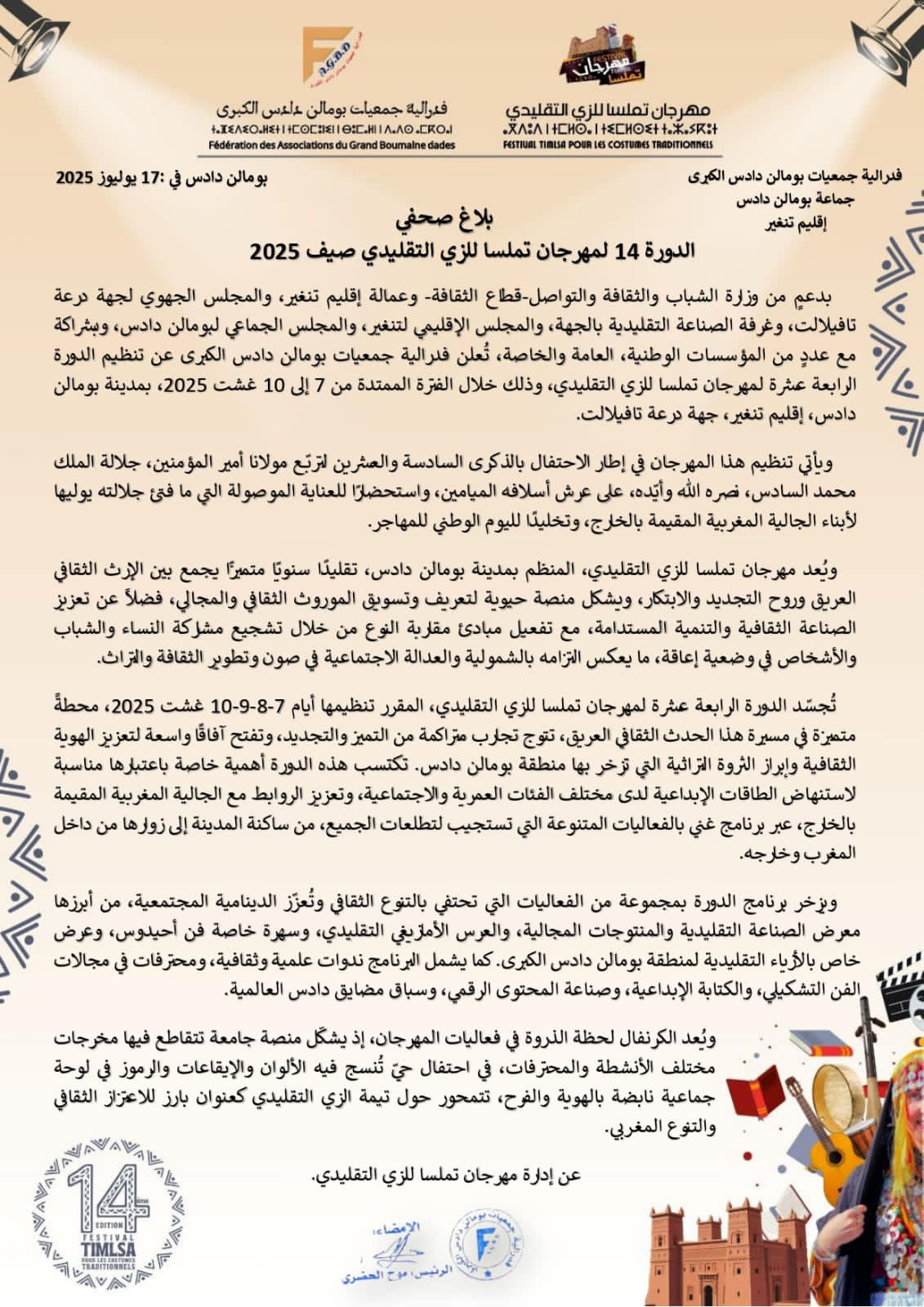 بدعمٍ من وزارة الشباب والثقافة والتواصل-قطاع الثقافة- وعمالة إقليم تنغير، والمجلس الجهوي لجهة درعة تافيلالت، وغرفة الصناعة التقليدية بالجهة، والمجلس الإقليمي لتنغير، والمجلس الجماعي لبومالن دادس، وبشراكة مع عددٍ من المؤسسات الوطنية، العامة والخاصة، تُعلن فدرالية جمعيات بومالن دادس الكبرى عن تنظيم الدورة الرابعة عشرة لمهرجان تملسا للزي التقليدي، وذلك خلال الفترة الممتدة من 7 إلى 10 غشت 2025، بمدينة بومالن دادس، إقليم تنغير، جهة درعة تافيلالت.