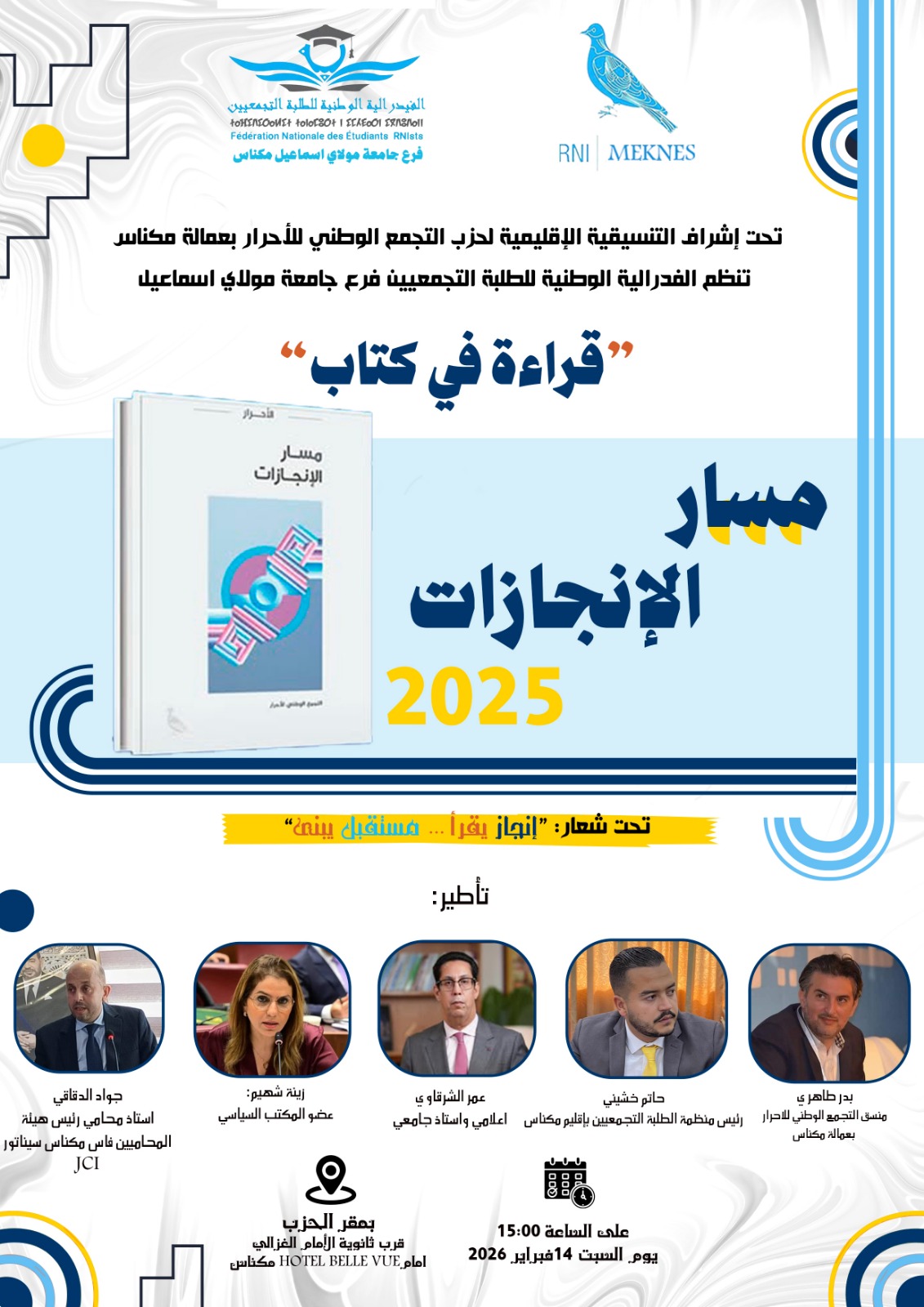 في السياسة، التوقيت ليس تفصيلا، وأحيانا يحمل أول نشاط أكثر مما تحمله عشرات البيانات. بعد أسبوع واحد فقط من انعقاد المؤتمر الوطني الاستثنائي لـ حزب التجمع الوطني للأحرار، وفي مستهل الولاية التنظيمية الجديدة بقيادة محمد شوكي، اختارت الفيدرالية الوطنية للطلبة التجمعيين – فرع جامعة مولاي إسماعيل بمكناس – أن تفتتح المرحلة بقراءة سياسية في كتاب «مسار الإنجازات».
