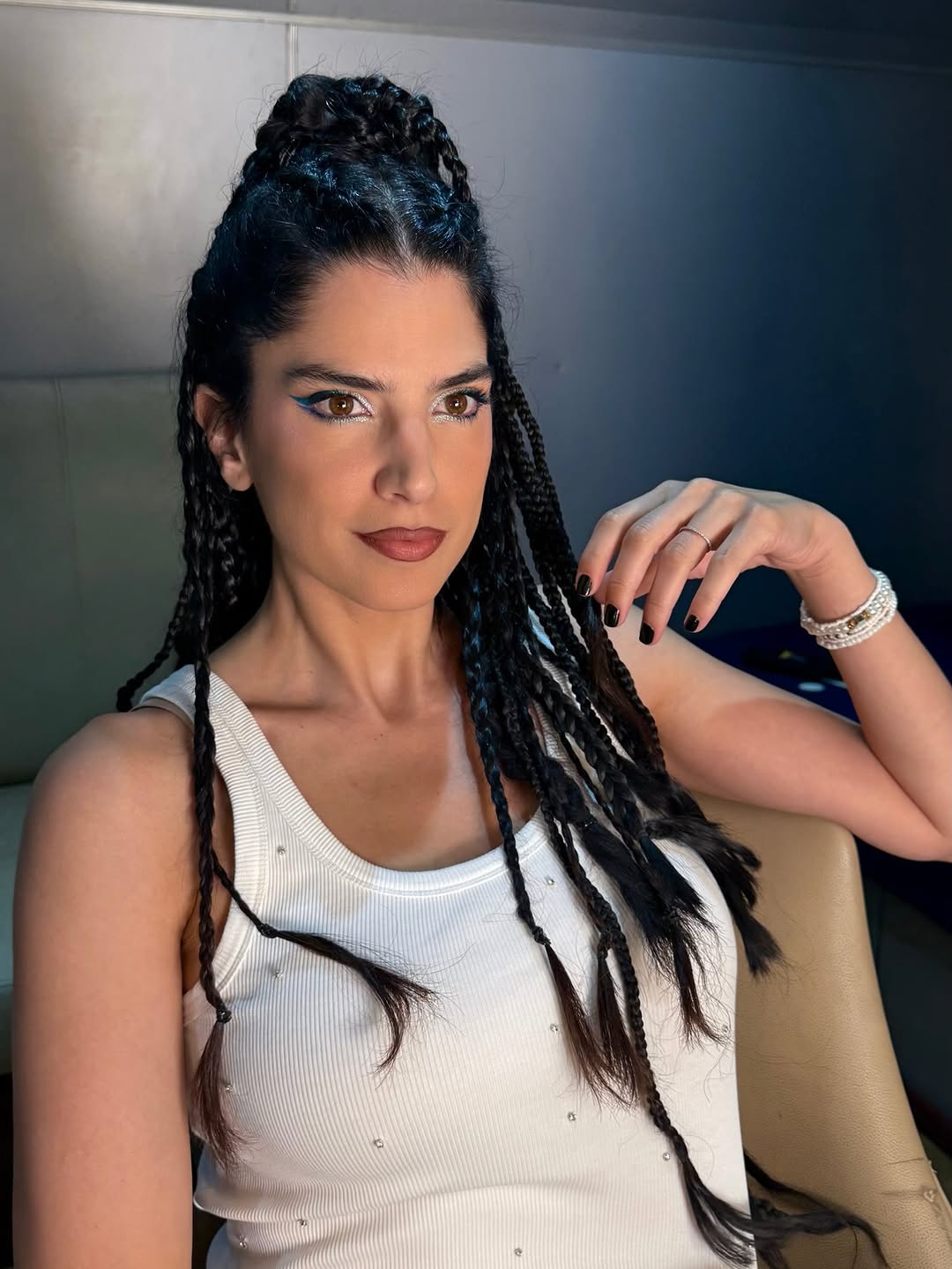 الرفعة العالية: جُمعت الضفائر في “شينيون” علوي مرتفع مع ترك خصلات مضفرة تنسدل بنعومة على الكتفين، مما دمج بين الشموخ والأنوثة.